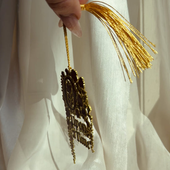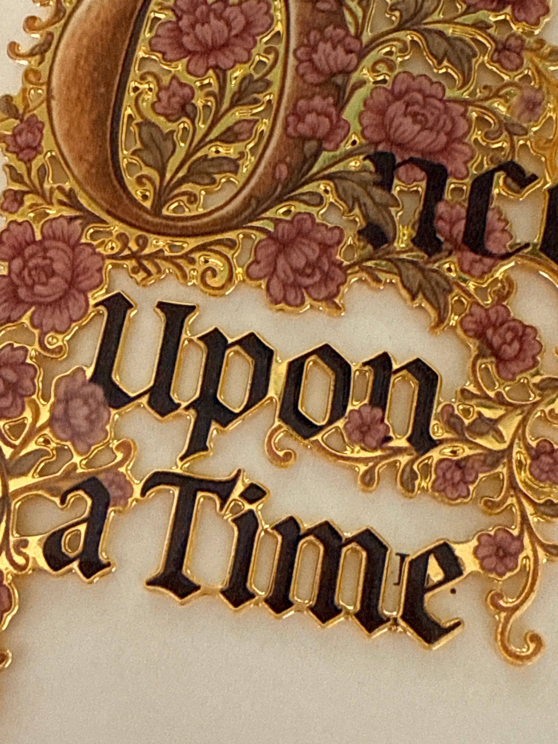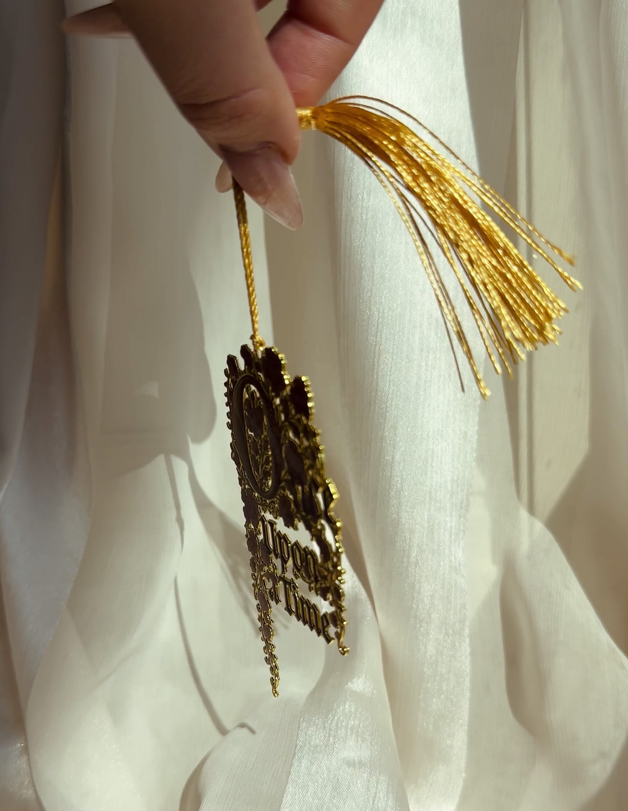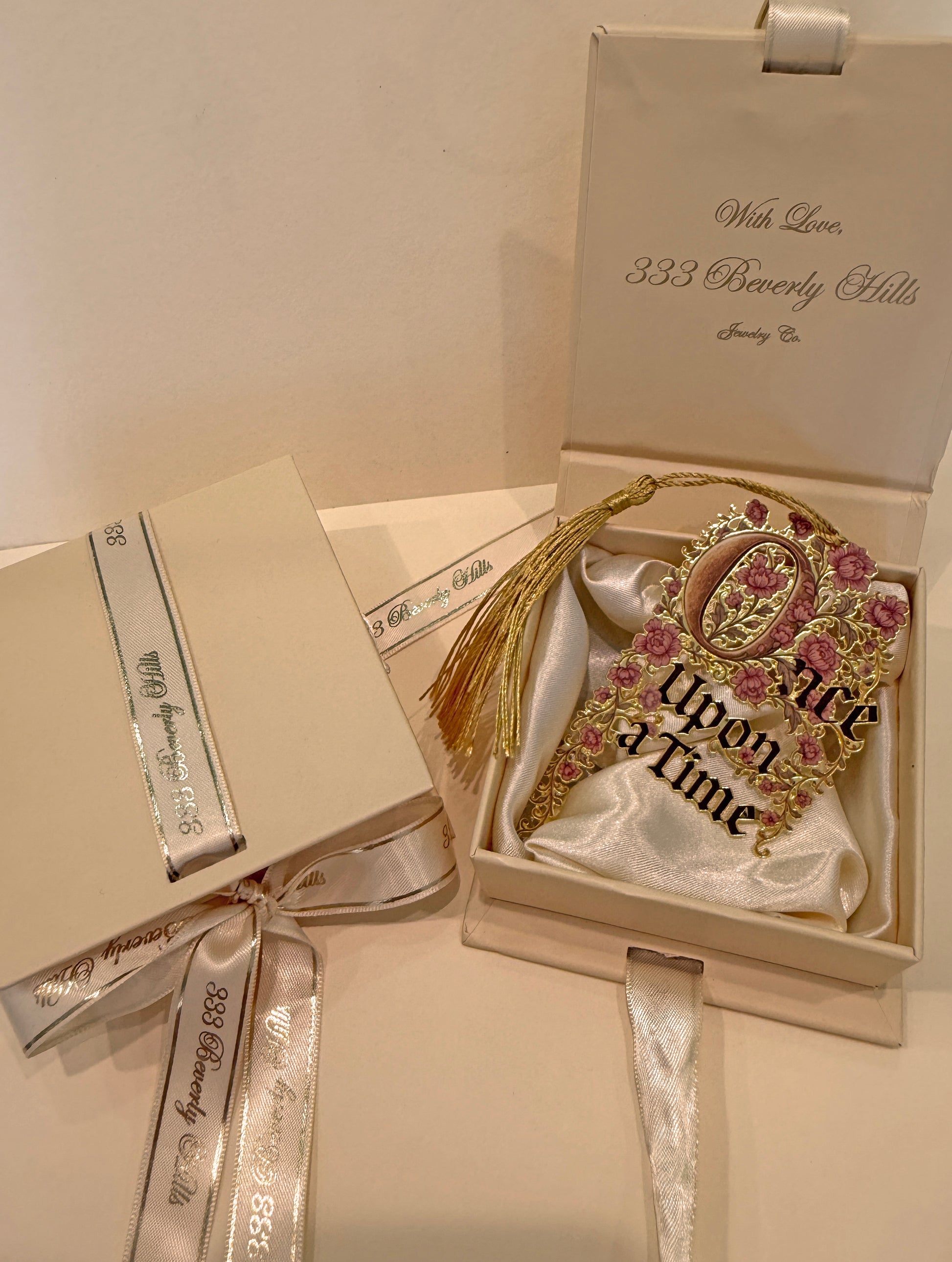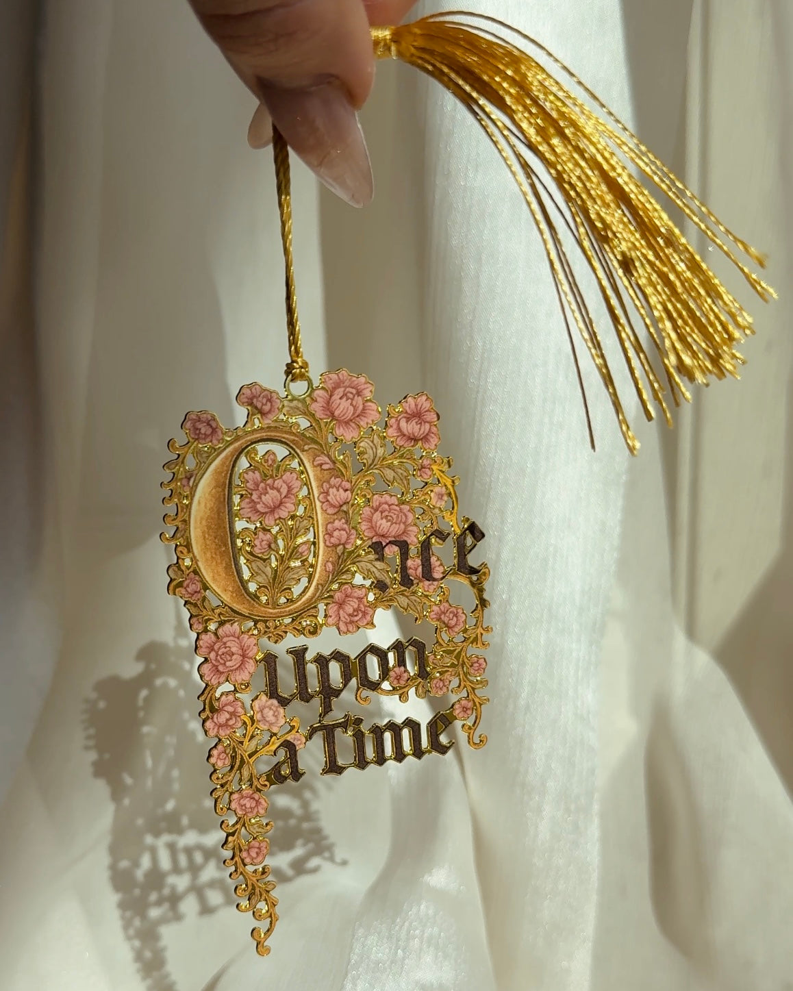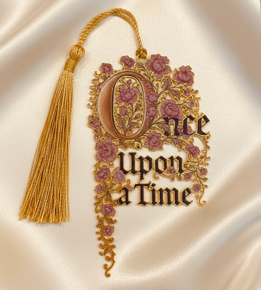 The most beautiful bookmark ever made. Our gilded metal bookmark is a delicate piece of art, designed from the pages of fairytale's past. Adorned with dusty pink roses and vines cascading around the classic text "Once Upon A Time"